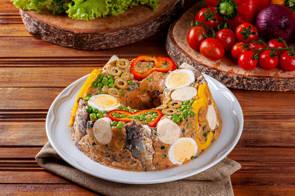 Inicialmente, higienize o tomate, a salsinha e cebola. Cozinhe os ovos, descasque e corte em 4 partes. Refogue a cebola no azeite e acrescentar, os pimentões, a sardinha ou atum, o milho, ervilha, a salsinha, acrescente a água e deixe ferver. Em seguida, coloque a farinha de milho aos poucos e mexa até formar uma massa. Unte e decore uma forma com rodelas de tomate, pedaços de sardinha, pimenta biquinho e os ovos cozidos. Despeje toda a massa na forma decorada, aperte bem, coloque um filme plástico por cima para retirada do ar e leve para gelar por uma hora. Após gelar, desenforme, coloque em uma travessa e sirva.