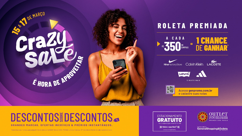 O Outlet Premium Grande São Paulo realiza, de 15 a 17 de março a Crazy Sale, tradicional campanha do empreendimento que combina descontos incríveis em cima dos valores já remarcados de renomadas marcas nacionais e internacionais, como Nike, Calvin Klein, Lacoste e adidas, e entretenimento em um final de semana especial que prometem agradar toda a família.