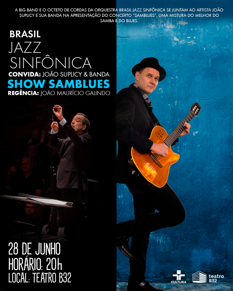 A Big Band e o Octeto de Cordas da Orquestra Brasil Jazz Sinfônica se juntam ao artista João Suplicy e sua banda no concerto “Samblues”, uma mistura do melhor do samba e do blues, nesta sexta-feira (28/6). Sob regência do maestro João Maurício Galindo, a apresentação acontece no Teatro B32, às 20h.