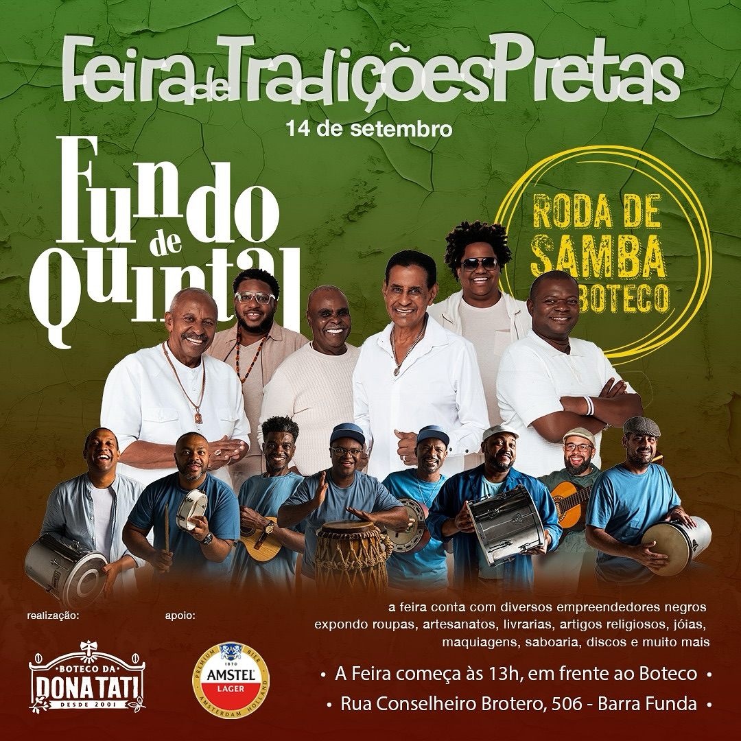 - Sábado (14/09), 13h – 11ª Feira de Tradições Pretas: Início da feira às 13h e samba a partir das 15h, com a Roda de Samba do Boteco e depois, pra fechar a noite, às 18h, Fundo de Quintal.