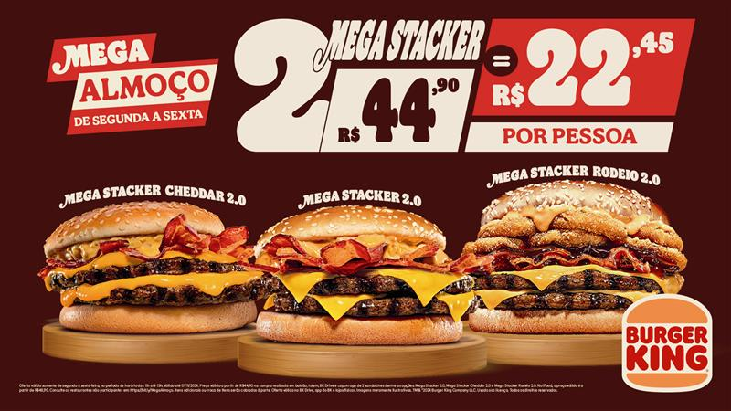 O preço a partir de R$ 44,90 é válido na compra de 2 sanduíches dentre as opções Mega Stacker 2.0, Mega Stacker Cheddar 2.0 e Mega Stacker Rodeio 2.0. Consulte os restaurantes não participantes em: https://bit.ly/MegaAlmoço.