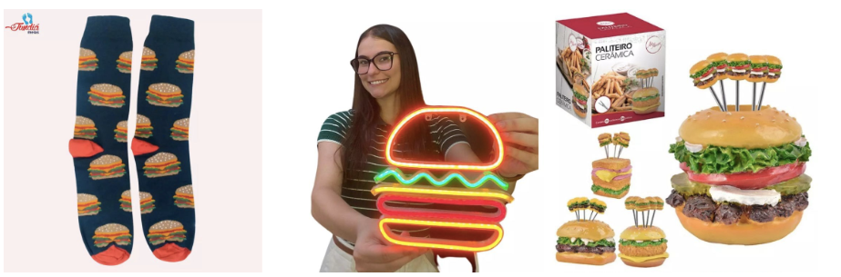 Já para presentear um fã de hambúrguer, os presentinhos do Kwai Shop são uma boa pedida. Aqui vão três sugestões: uma meia fofíssima de hambúrgueres (R$ 28,80), vendida na loja Jundia Meias, uma luminária de neon (R$125,91) e o ímã de geladeira (R$ 18 o kit com dois).