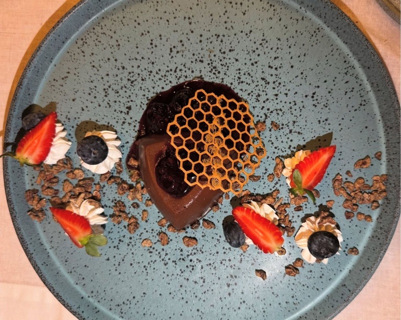 Para harmonizar, a carta de vinhos oferece uma seleção criteriosa de rótulos nacionais e internacionais, além de drinks autorais com mel de cacau, proporcionando uma experiência completa.